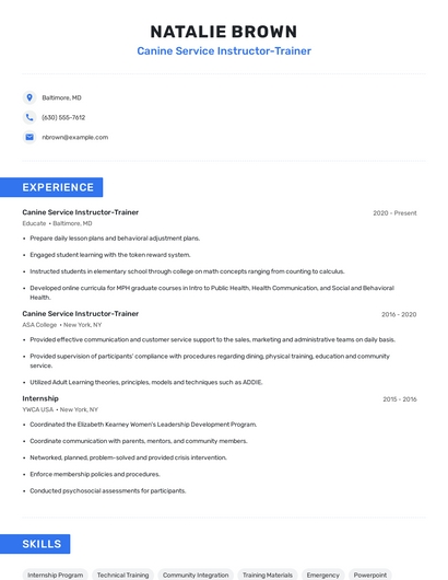 Choose from 10+ customizable canine service instructor-trainer resume templates