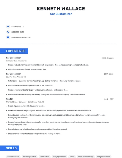 Build a professional car customizer resume in minutes. Our AI resume writing assistant will guide you through every step of the process, and you can choose from 10+ resume templates to create your car customizer resume.7. Customer Complaints
