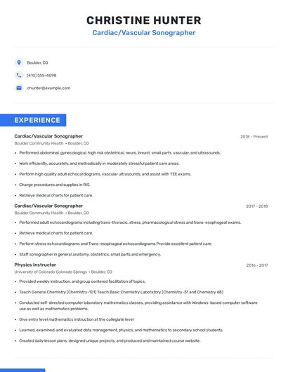 Build a professional cardiac/vascular sonographer resume in minutes. Browse through our resume examples to identify the best way to word your resume. Then choose from 5+ resume templates to create your cardiac/vascular sonographer resume.