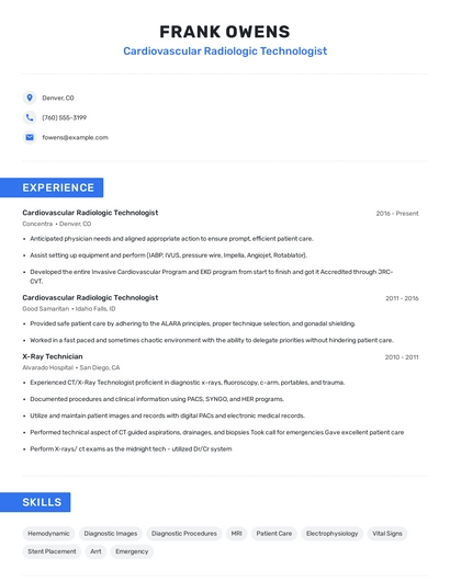 Build a professional cardiovascular radiologic technologist resume in minutes. Browse through our resume examples to identify the best way to word your resume. Then choose from 5+ resume templates to create your cardiovascular radiologic technologist resume.