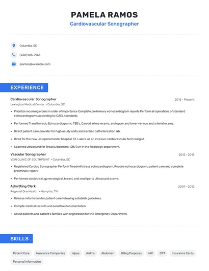 Build a professional cardiovascular sonographer resume in minutes. Browse through our resume examples to identify the best way to word your resume. Then choose from 5+ resume templates to create your cardiovascular sonographer resume.