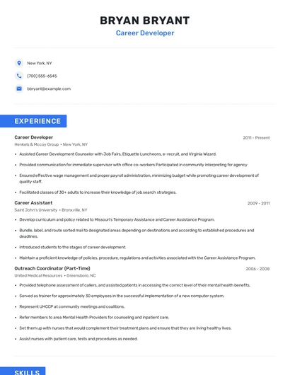 Build a professional career developer resume in minutes. Browse through our resume examples to identify the best way to word your resume. Then choose from 5+ resume templates to create your career developer resume.