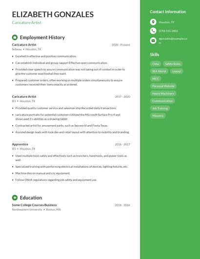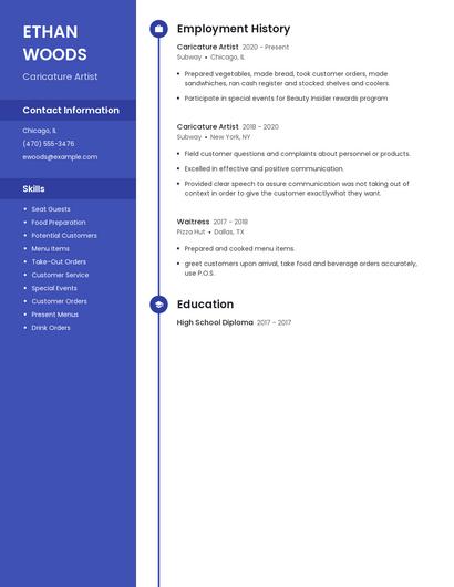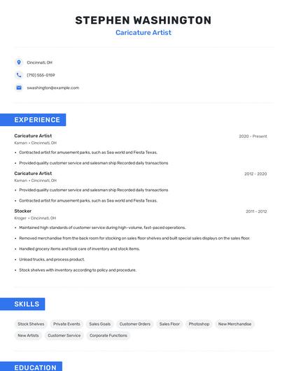 You can use Zippia's AI resume builder to make the resume writing process easier while also making sure that you include key information that hiring managers expect to see on a caricature artist resume. You'll find resume tips and examples of skills, responsibilities, and summaries, all provided by Zippi, your career sidekick.