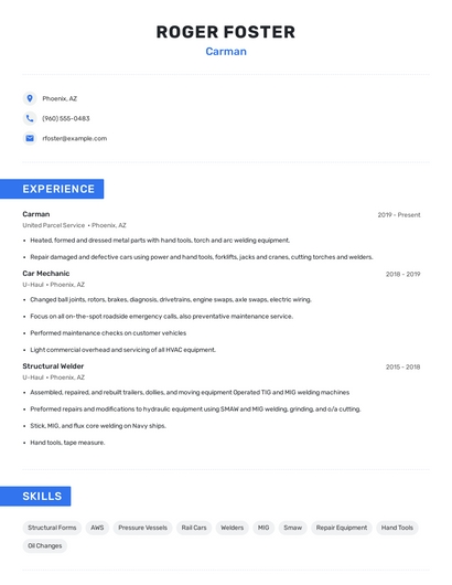 Build a professional carman resume in minutes. Browse through our resume examples to identify the best way to word your resume. Then choose from 5+ resume templates to create your carman resume.