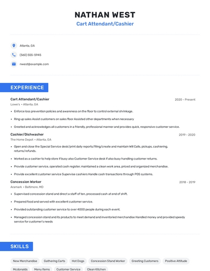 Build a professional cart attendant/cashier resume in minutes. Browse through our resume examples to identify the best way to word your resume. Then choose from 5+ resume templates to create your cart attendant/cashier resume.