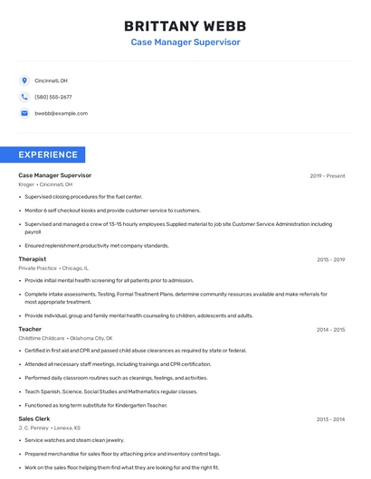 Build a professional case manager supervisor resume in minutes. Browse through our resume examples to identify the best way to word your resume. Then choose from 5+ resume templates to create your case manager supervisor resume.