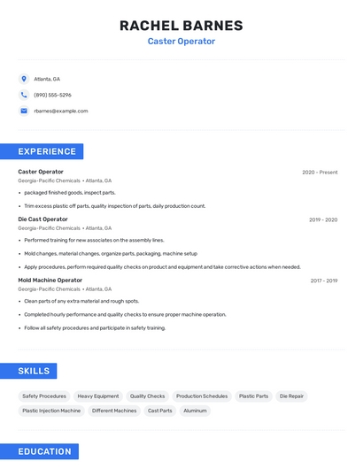 Build a professional caster operator resume in minutes. Browse through our resume examples to identify the best way to word your resume. Then choose from 5+ resume templates to create your caster operator resume.