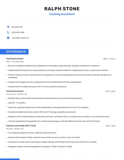 Build a professional casting assistant resume in minutes. Browse through our resume examples to identify the best way to word your resume. Then choose from 5+ resume templates to create your casting assistant resume.