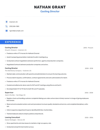 Build a professional casting director resume in minutes. Browse through our resume examples to identify the best way to word your resume. Then choose from 5+ resume templates to create your casting director resume.