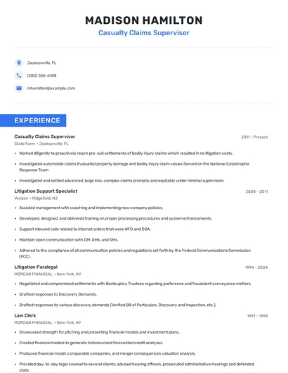 Build a professional casualty claims supervisor resume in minutes. Browse through our resume examples to identify the best way to word your resume. Then choose from 5+ resume templates to create your casualty claims supervisor resume.