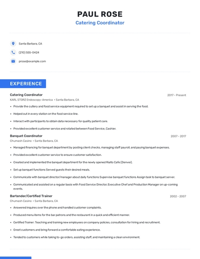 Build a professional catering coordinator resume in minutes. Browse through our resume examples to identify the best way to word your resume. Then choose from 5+ resume templates to create your catering coordinator resume.