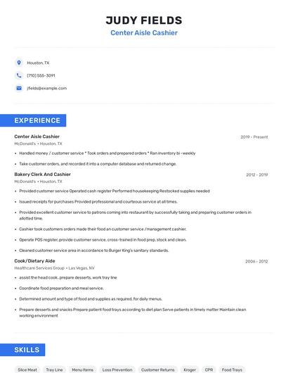 Build a professional center aisle cashier resume in minutes. Browse through our resume examples to identify the best way to word your resume. Then choose from 5+ resume templates to create your center aisle cashier resume.