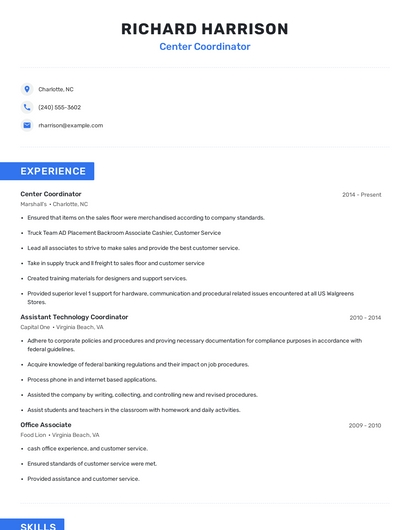 Build a professional center coordinator resume in minutes. Browse through our resume examples to identify the best way to word your resume. Then choose from 5+ resume templates to create your center coordinator resume.