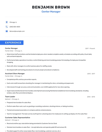 Build a professional center manager resume in minutes. Browse through our resume examples to identify the best way to word your resume. Then choose from 5+ resume templates to create your center manager resume.