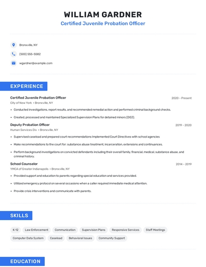 Build a professional certified juvenile probation officer resume in minutes. Our AI resume writing assistant will guide you through every step of the process, and you can choose from 10+ resume templates to create your certified juvenile probation officer resume.What skills help Certified Juvenile Probation Officers find jobs?