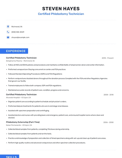 Build a professional certified phlebotomy technician resume in minutes. Browse through our resume examples to identify the best way to word your resume. Then choose from 5+ resume templates to create your certified phlebotomy technician resume.