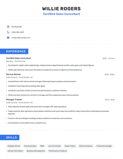 Build a professional certified sales consultant resume in minutes. Browse through our resume examples to identify the best way to word your resume. Then choose from 5+ resume templates to create your certified sales consultant resume.