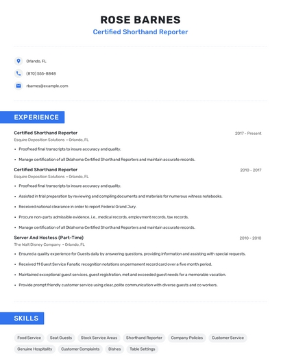 Build a professional certified shorthand reporter resume in minutes. Our AI resume writing assistant will guide you through every step of the process, and you can choose from 10+ resume templates to create your certified shorthand reporter resume.What skills help Certified Shorthand Reporters find jobs?