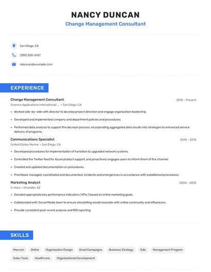 Build a professional change management consultant resume in minutes. Browse through our resume examples to identify the best way to word your resume. Then choose from 5+ resume templates to create your change management consultant resume.