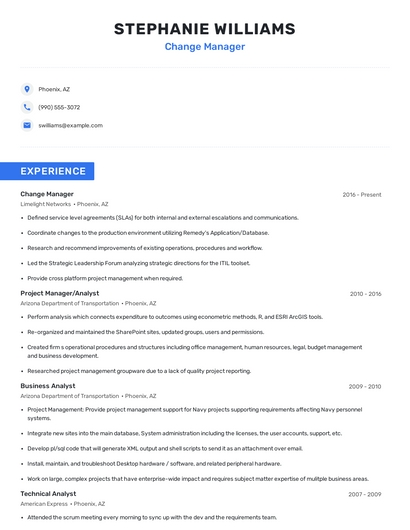 Build a professional change manager resume in minutes. Browse through our resume examples to identify the best way to word your resume. Then choose from 5+ resume templates to create your change manager resume.