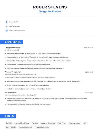 Build a professional charge bookkeeper resume in minutes. Browse through our resume examples to identify the best way to word your resume. Then choose from 5+ resume templates to create your charge bookkeeper resume.