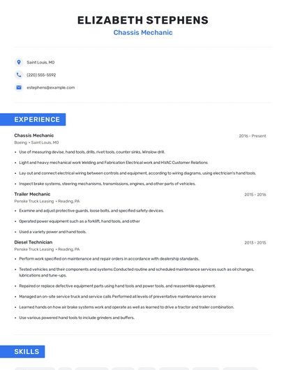 Build a professional chassis mechanic resume in minutes. Browse through our resume examples to identify the best way to word your resume. Then choose from 5+ resume templates to create your chassis mechanic resume.