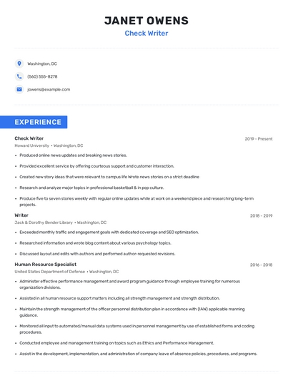 The most important skills for a check writer resume and required skills for a check writer to have include: