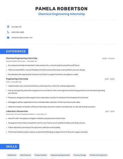 Build a professional chemical engineering internship resume in minutes. Browse through our resume examples to identify the best way to word your resume. Then choose from 5+ resume templates to create your chemical engineering internship resume.