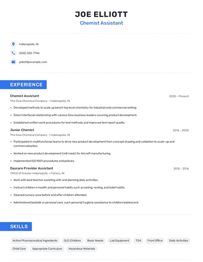 Build a professional chemist assistant resume in minutes. Browse through our resume examples to identify the best way to word your resume. Then choose from 5+ resume templates to create your chemist assistant resume.
