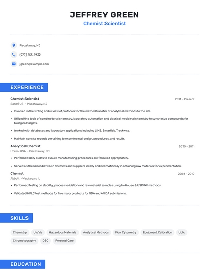 Build a professional chemist scientist resume in minutes. Browse through our resume examples to identify the best way to word your resume. Then choose from 5+ resume templates to create your chemist scientist resume.