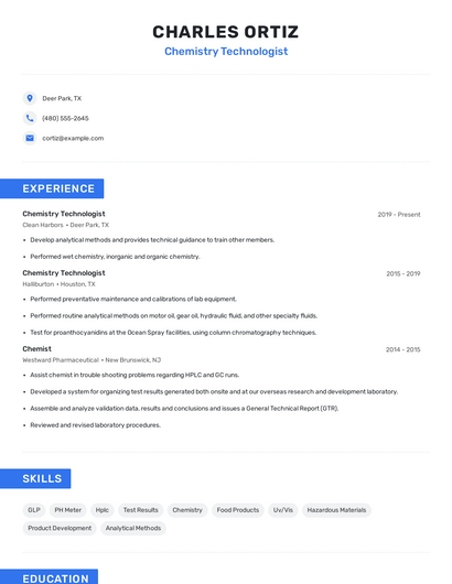 Build a professional chemistry technologist resume in minutes. Browse through our resume examples to identify the best way to word your resume. Then choose from 5+ resume templates to create your chemistry technologist resume.