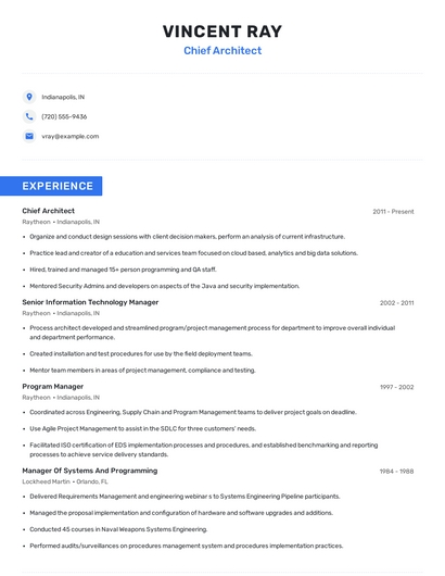 Build a professional chief architect resume in minutes. Browse through our resume examples to identify the best way to word your resume. Then choose from 5+ resume templates to create your chief architect resume.