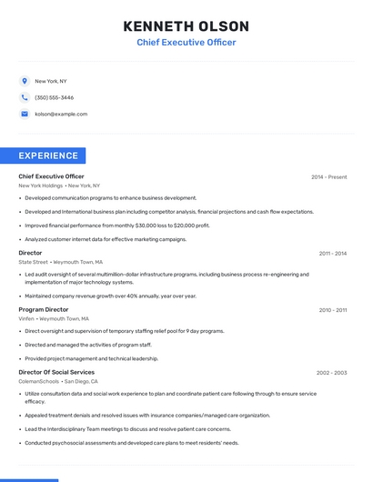 Build a professional chief executive officer resume in minutes. Browse through our resume examples to identify the best way to word your resume. Then choose from 5+ resume templates to create your chief executive officer resume.