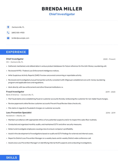 Build a professional chief investigator resume in minutes. Browse through our resume examples to identify the best way to word your resume. Then choose from 5+ resume templates to create your chief investigator resume.