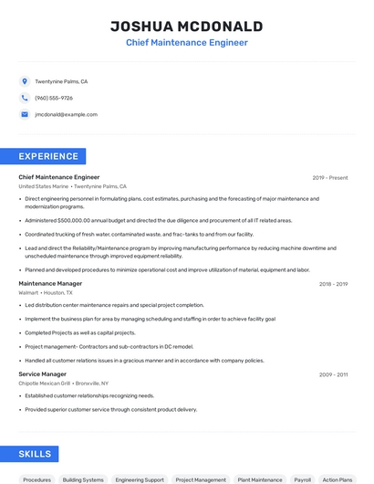 Build a professional chief maintenance engineer resume in minutes. Browse through our resume examples to identify the best way to word your resume. Then choose from 5+ resume templates to create your chief maintenance engineer resume.