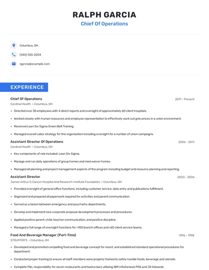 Build a professional chief of operations resume in minutes. Browse through our resume examples to identify the best way to word your resume. Then choose from 5+ resume templates to create your chief of operations resume.