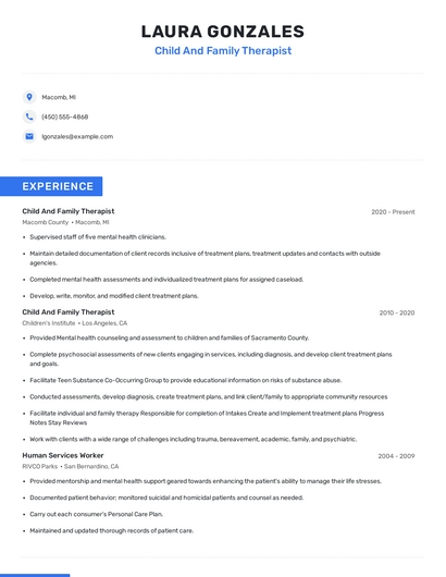 Build a professional child and family therapist resume in minutes. Browse through our resume examples to identify the best way to word your resume. Then choose from 5+ resume templates to create your child and family therapist resume.