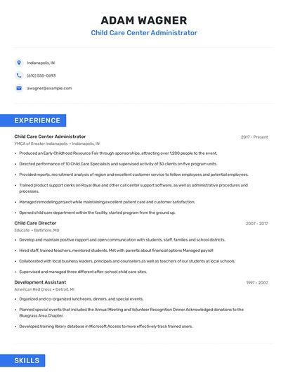 Build a professional child care center administrator resume in minutes. Browse through our resume examples to identify the best way to word your resume. Then choose from 5+ resume templates to create your child care center administrator resume.
