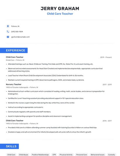 Build a professional child care teacher resume in minutes. Browse through our resume examples to identify the best way to word your resume. Then choose from 5+ resume templates to create your child care teacher resume.