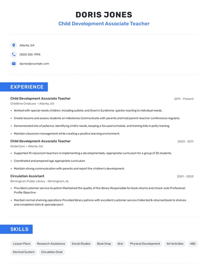 The most important skills for a child development associate teacher resume and required skills for a child development associate teacher to have include:
