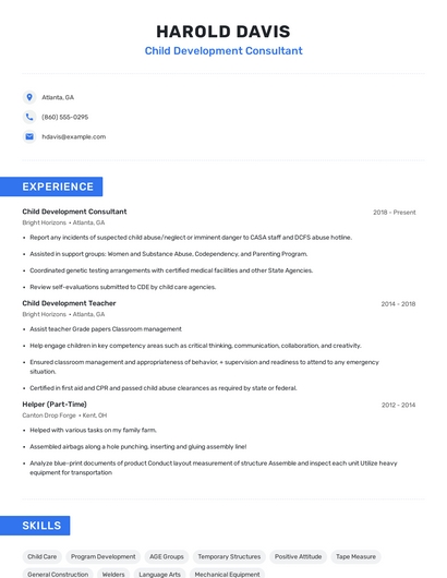 Build a professional child development consultant resume in minutes. Browse through our resume examples to identify the best way to word your resume. Then choose from 5+ resume templates to create your child development consultant resume.