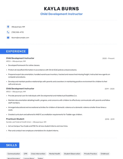 Build a professional child development instructor resume in minutes. Browse through our resume examples to identify the best way to word your resume. Then choose from 5+ resume templates to create your child development instructor resume.