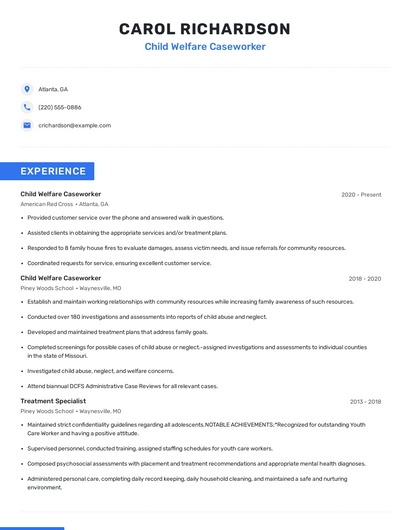 Build a professional child welfare caseworker resume in minutes. Browse through our resume examples to identify the best way to word your resume. Then choose from 5+ resume templates to create your child welfare caseworker resume.