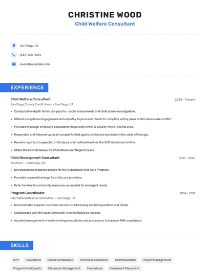Build a professional child welfare consultant resume in minutes. Our AI resume writing assistant will guide you through every step of the process, and you can choose from 10+ resume templates to create your child welfare consultant resume.What skills help Child Welfare Consultants find jobs?