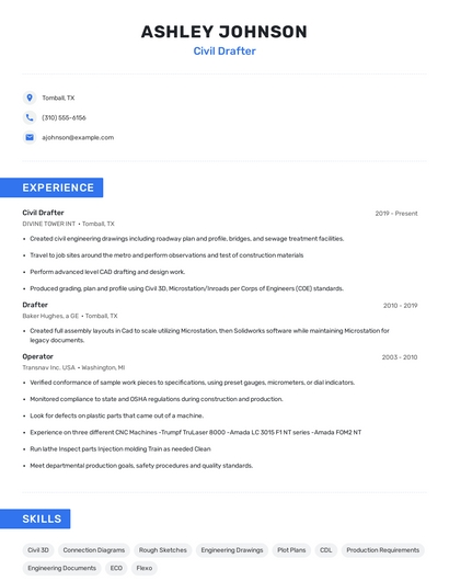 Build a professional civil drafter resume in minutes. Browse through our resume examples to identify the best way to word your resume. Then choose from 5+ resume templates to create your civil drafter resume.