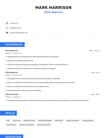 Build a professional claim approver resume in minutes. Browse through our resume examples to identify the best way to word your resume. Then choose from 5+ resume templates to create your claim approver resume.