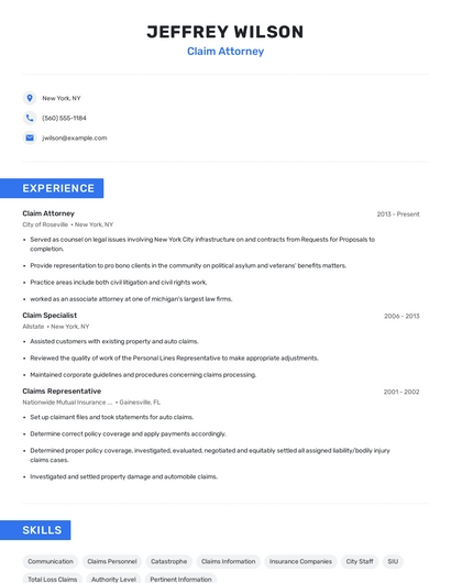 Build a professional claim attorney resume in minutes. Browse through our resume examples to identify the best way to word your resume. Then choose from 5+ resume templates to create your claim attorney resume.
