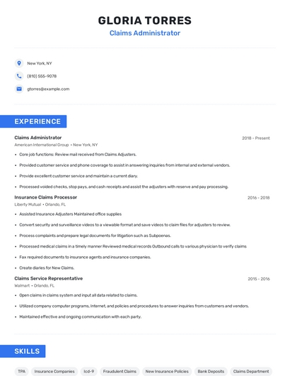 Build a professional claims administrator resume in minutes. Browse through our resume examples to identify the best way to word your resume. Then choose from 5+ resume templates to create your claims administrator resume.
