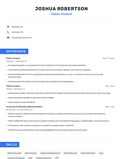 Build a professional claims analyst resume in minutes. Browse through our resume examples to identify the best way to word your resume. Then choose from 5+ resume templates to create your claims analyst resume.