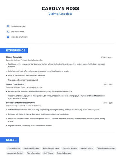 Build a professional claims associate resume in minutes. Browse through our resume examples to identify the best way to word your resume. Then choose from 5+ resume templates to create your claims associate resume.